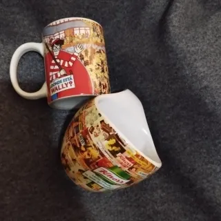 Set di due tazze in ceramica, una con il design di Dov'è Wally? e l'altra con motivi Knorr. - Tazza Dov'è Wally? con illustrazione del personaggio e testo Dov'è Wally?. - Tazza Knorr con collage di immagini e loghi del marchio, incluso lo slogan ogni pasto è un'opportunità. Ci sono due tazze con coperchi per infusi e tè. -Tutte nuove, mai usate. Prezzo per unità. A 3€ e 4€ quelle con filtro e coperchio.