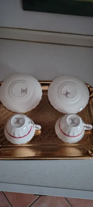 Splendido set di due tazze con piattini abbinati, decorate con un delicato disegno floreale di rose in tonalità rosa e verde. Il bordo delle tazze è rifinito con un sottile bordo dorato.