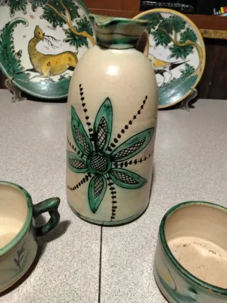 Set di caraffa e tazze antiche con un design floreale dipinto a mano. - Caraffa con collo decorato in verde. - Tazze con manico e dettagli vegetali. - Ceramica con finitura opaca.