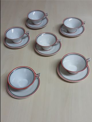 Set di sei tazze da caffè antiche con piattini. Potrebbero essere degli anni '40. Design classico con dettagli in rosso e verde. Perfette per l'uso quotidiano o per occasioni speciali. In ottimo stato di conservazione. Ideali per collezionisti o per dare un tocco vintage alla tua casa.