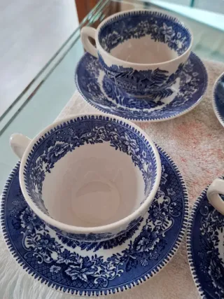 Bellissime tazze da caffè di Loza LA CARTUJA de Sevilla (Pickman S.A) risalenti al 1920 circa in Spagna. Terracotta decorata con la tecnica Transferware, decorazione classica dell'epoca. Sono di buone dimensioni, i piatti hanno un diametro di 17 cm e le tazze hanno un'altezza di 9 cm e un diametro nella bocca di 11,5 cm (sono come una ciotola). STATO DI CONSERVAZIONE: Sono molto buoni, hanno un tono crepitante e bello, appena li vedi sai quanti anni hanno, non hanno alcuna rottura.