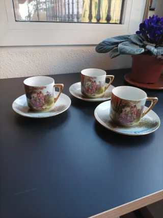 Set di tre tazze da caffè antiche con piattini. Design classico con scene dipinte a mano. Bordi e manici dorati. Ideali per collezionisti o decorazione.