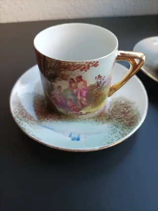 Set di sette tazze antiche con un design classico ed elegante. Ogni tazza presenta una scena romantica e un bordo decorativo dorato. Ideali per collezionisti o per aggiungere un tocco vintage alla tua casa.