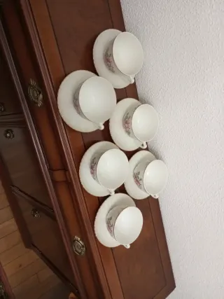 Set di sei tazze di porcellana antiche, ciascuna con il proprio piattino, e una latte che si abbina, ma credo non faccia parte del set. I piattini misurano 11 cm di diametro e le tazze 7,5 cm di diametro per 4,5 cm di altezza. - Design floreale delicato. - Bordo dorato. - Include una latte abbinata.