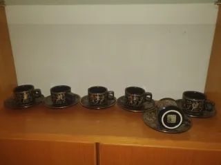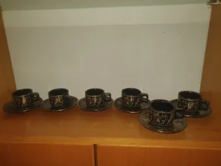 Set di sei tazze da caffè in stile antico, con un design intricato e dettagli dorati. Sei tazze in ceramica nera. Ogni tazza include il suo piattino abbinato. Decorazione con motivi classici in oro. FABICADO EN GRECIA. DIBUJADOS A MANO. DECORADO CON ORO DE 24 QUILATES