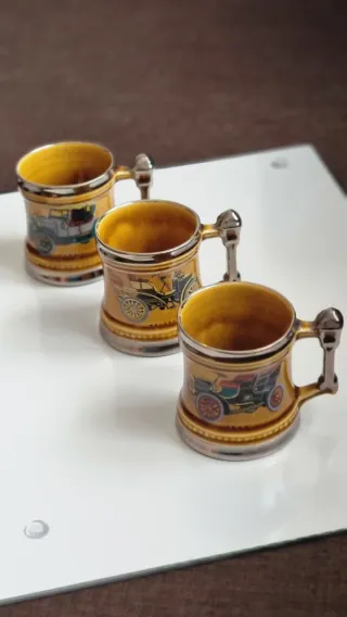 Set di 3 tazze vintage originali di Britannia Designs, decorate con illustrazioni di auto classiche antiche. ✔ Ceramica inglese ✔ Stile anni '70-'80 ✔ Finitura craquelée originale ✔ Tutte diverse ✔ Ottime condizioni, senza urti o crepe Pezzi ideali per collezioni, decorazioni vintage, case di campagna, caffetterie a tema o per gli amanti delle auto classiche. Prezzo: 15 € unità 35 € le tre (prezzo speciale per lotto) Consegna a mano a Málaga. Spedizione anche tramite Wallapop.
