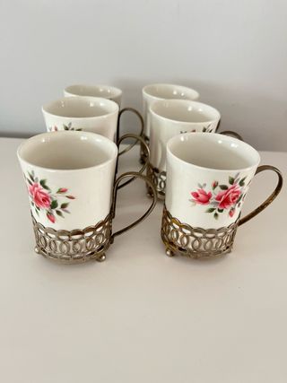 Set di tazze da tè antiche con un delicato design floreale. - Design di rose in colore rosa. - Bordo dorato. - Include piattini abbinati