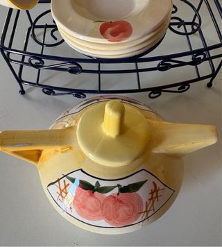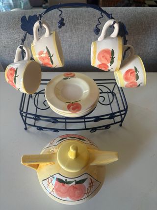 Set caffè composto da 4 tazzine, 4 piattini, una teiera e un supporto in metallo.