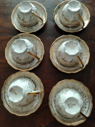 Elegante servizio di tazze in porcellana da caffè antiche, perfette per un tocco di classe. - Set di 10 tazzine con piattini. - Decorazioni dorate sui bordi. - Design classico e raffinato.