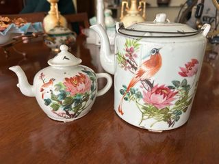 Teiere cinesi in porcellana della famiglia Famille Rose, probabilmente del XIX secolo. Presentano decorazioni dipinte a mano con uccelli e fiori, come peonie o fiori di loto. La teiera più grande ha un manico in metallo, mentre quella più piccola ha un manico in porcellana. Sono oggetti d'antiquariato e da collezione. Mostrano segni di usura e piccole imperfezioni, come scheggiature o crepe, tipiche dell'età
