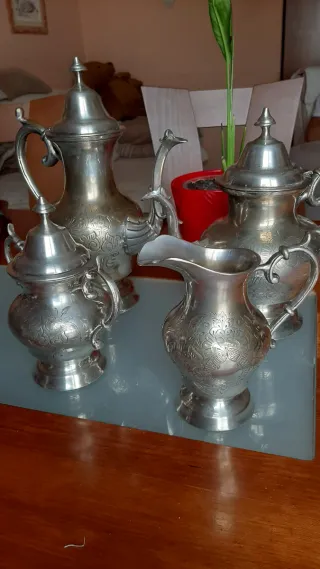 Set di teiere in artigianato tradizionale arabo. Pezzi con un design intricato ed elegante. Realizzato in metallo argentato. Decorazione floreale incisa. Include teiere, zuccheriera e caraffa. Misure: 32 × 26 cm, 26 × 27 cm, 16 × 15 cm, 20 × 19 cm. Necessitano di una buona pulizia a causa del tempo trascorso.