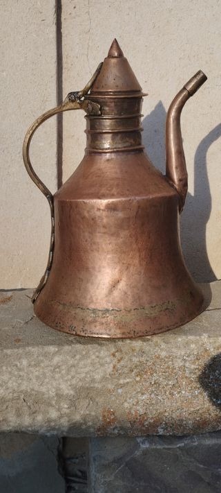 Lot di due antiche teiere in stile orientale. Una realizzata in ottone e l'altra in rame e ottone. Pezzi lavorati in rilievo, con decorazione araba/orientale e bella patina invecchiata. Molto pesanti e robuste. Ideali per decorazione, collezionismo, ambientazione, vetrine o set vintage. I coperchi sono stati riparati e attualmente non sono funzionali, non si aprono. Si vendono come pezzi decorativi. Si vende il lotto completo come si vede nelle foto. Prezzo negoziabile.