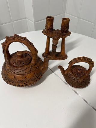 Vendo un vecchio set di 2 teiere di diverse dimensioni e 1 portacandele, in ceramica (argilla)