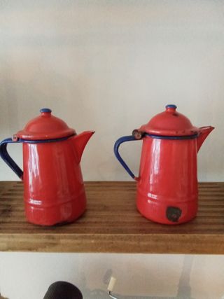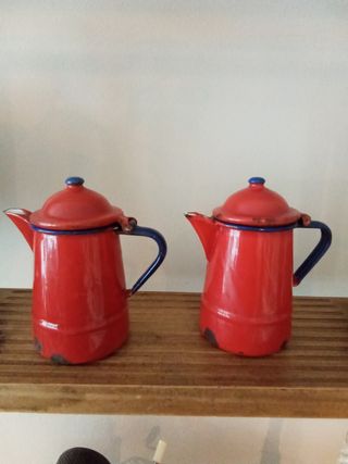 Teiere antiche smaltate 2 piccole rosse che misurano 14 cm di altezza prezzo unitario 15€. Ideale per la decorazione.