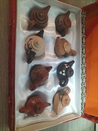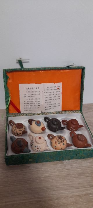 Prezioso e antico set di teiere orientali Yixing in miniatura, dipinte e realizzate a mano in terracotta