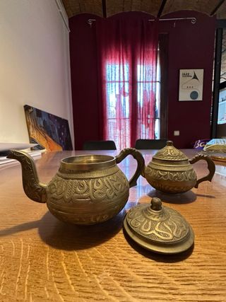 Set di teiere e caraffe in stile antico, perfette per collezionisti o decorazione. Presentano un discreto usura. - Design orientale. - Materiali metallici. - Dettagli incisi.