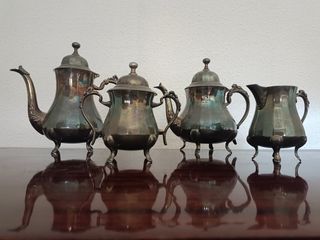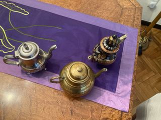 Set di teiere antiche con un design classico ed elegante. - Teiere in argento e bronzo. - Pezzi decorativi con dettagli ornamentali. - Ideale per collezionisti o amanti delle antichità.