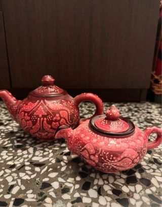 Set di due teiere in ceramica con decorazioni etniche. - Colore rosso e rosa. - Design unico e artigianale. Dipinte a mano