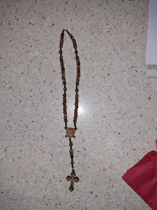 Rosario fatto a mano con perline in legno. - Perline in legno naturale. - Crocifisso in legno. - Medaglione centrale in legno.