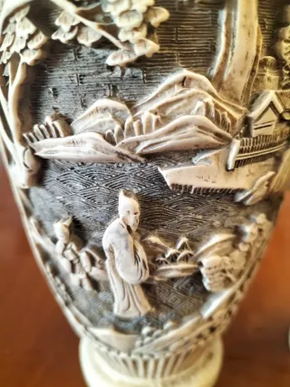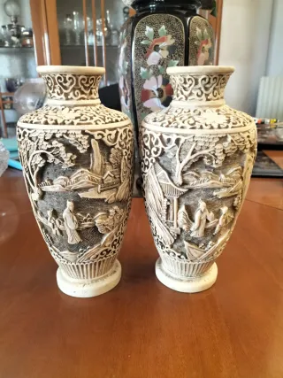 Bellissima coppia di vasi Cinesia antichi in resina dura beige finemente decorati con scene e figure intagliati a mano artigianali l'altezza è di 21 CM - Design intagliato e dettagliato. - Perfetti come elementi decorativi.