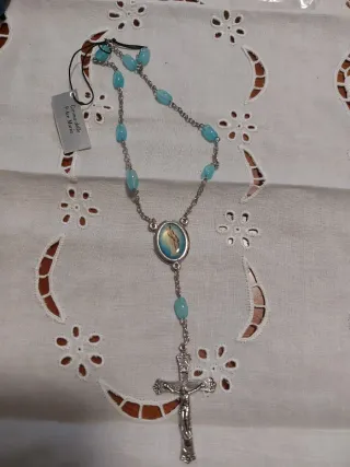 Bellissimo rosario con perline azzurre e dettagli in metallo. - Medaglia centrale raffigurante la Madonna. - Crocifisso in metallo. - Perline ovali azzurre.
