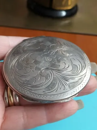 Elegante portacipria con specchietto antico realizzato in argento 800 inciso a mano il diametro è di 6,5 CM - Incisione a mano con motivi floreali e volute. - Bordatura decorata con motivo a zig-zag.