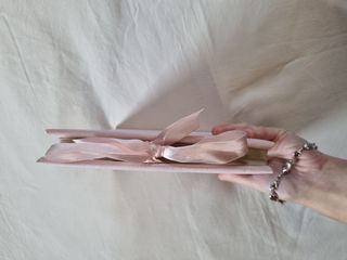 Carpeta rosa para fotos y polaroid, se abre con un lazo en la parte delantera. En la portada existe la posibilidad de poner una foto o una imagen que prefieras. Dentro de cada página hay espacio para la foto y espacio para una breve nota o leyenda. Me lo dieron hace unos años, pero nunca lo usé. Regalo ideal para bautizos, comuniones, confirmaciones, Navidad o cumpleaños.