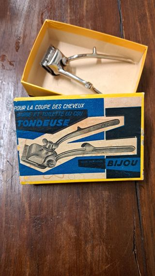Antico taglia capelli manuale marca bijou made in france. Probabilmente primi anni 60 in stupende condizioni, ancora ben funzionante e con la confezione originale. Segni del tempo sia sulla confezione che sull'oggetto ne esaltano l'originalità.