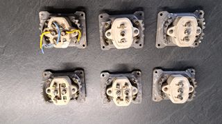 Set materiale elettrico vintage composto da 3 interruttori e 3 deviatori elettrici anni 70 con corpo ceramico per incasso in scatole tonde. In buone condizioni, solo un interruttore è privo di due viti di fissaggio facilmente reperibili vedi foto dettaglio. Introvabili. Per sostituzione o restauro di vecchi impianti.