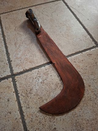 Vendo questo macete antico, realizzato in legno con finitura color ruggine. Sembra essere in buone condizioni, considerando la sua età. - Manico in legno scuro, lavorato artigianalmente. - Lama in legno, curvata a forma di mezzaluna. - Colore marrone rossiccio, effetto anticato. Manico un po usurato che ne attesta l antichità