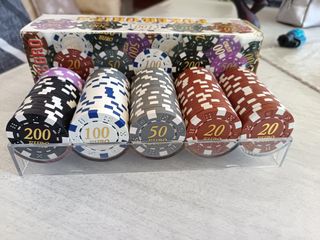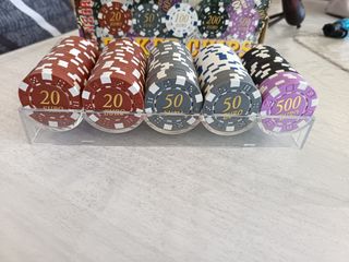 Set di fiches da poker con diversi tagli. - Fiches da 200 Euro (nere) - Fiches da 100 Euro (bianche e blu) - Fiches da 50 Euro (grigie) - Fiches da 20 Euro (rosse) - Fiches da 500 Euro (viola e nere) - Fiches da 200 Euro (nere e bianche)