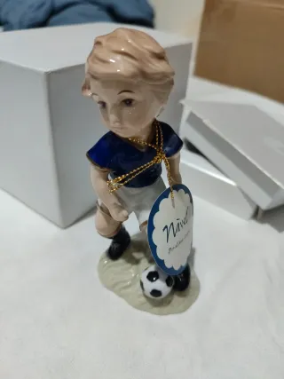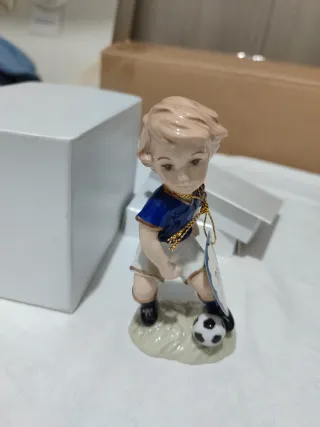 Graziosa statuetta di un bambino Navel in ceramica, intento a giocare con un pallone da calcio. Un'adorabile decorazione. - Realizzato in ceramica di alta qualità. - Dettagli curati e finiture lucide. - Design che raffigura un bambino con abbigliamento sportivo.