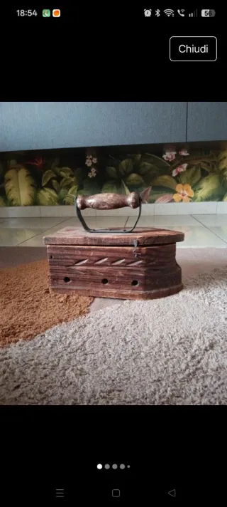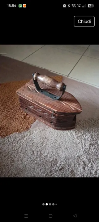 Antico ferro da stiro in legno, un pezzo d'epoca che aggiunge un tocco di storia. - Realizzato in legno con dettagli intagliati. - Manico in legno e metallo.