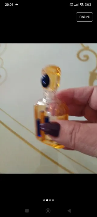 Raffinata bottiglietta in vetro soffiato, un pezzo vintage che porta con sé l'arte di Murano. Il design unico e i colori vivaci la rendono un oggetto decorativo speciale. - Realizzata in vetro soffiato. - Design vintage ispirato a Murano. - Colore giallo ambrato con dettagli blu intenso.