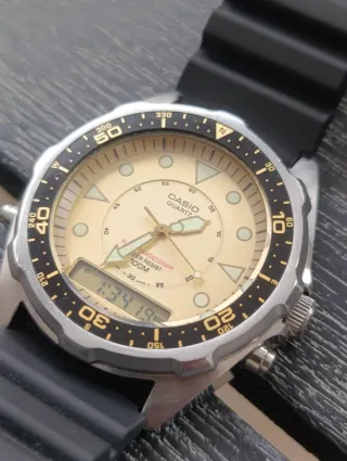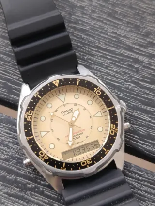 Orologio Casio vintage analogico-digitale, modello AMW320C. Orologio in ottime condizioni lievi segni di usura, qualche graffio al fondello come da foto,e una piccola ammaccatura alla corona ma tutto perfettamente funzionante. Ottime condizioni generali, cinturino originale Casio. Solo orologio senza scatola e istruzioni ma sarà spedito imballato accuratamente. - Quadrante color crema. - Ghiera girevole con indicazioni. - Resistente all'acqua fino a 100 metri.