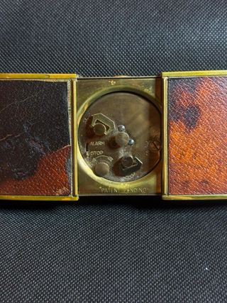 Elegante orologio da tavolo Oriental con cassa in metallo dorato e finiture in similpelle effetto tartarugato. - Movimento a 7 rubini. - Quadrante color oro con indici neri. - Design compatto e raffinato.