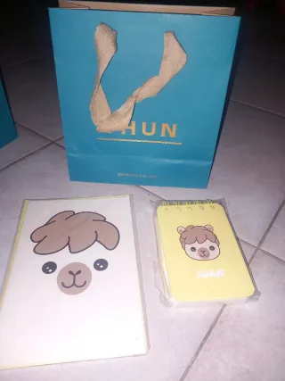 Set composto da tre articoli del marchio Thun. - Un sacchetto regalo blu con logo dorato. - Un bloc-notes bianco con disegno di un lama. - Un piccolo bloc-notes giallo con disegno di un lama e nome JUAN.