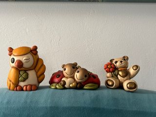 Delizioso set di tre statuine Thun. - Civetta con quadrifoglio. - Due coccinelle abbracciate. - Orsetto con fiori rossi. Per acquisti di pezzi singoli si considera il prezzo di 20€ l’uno.