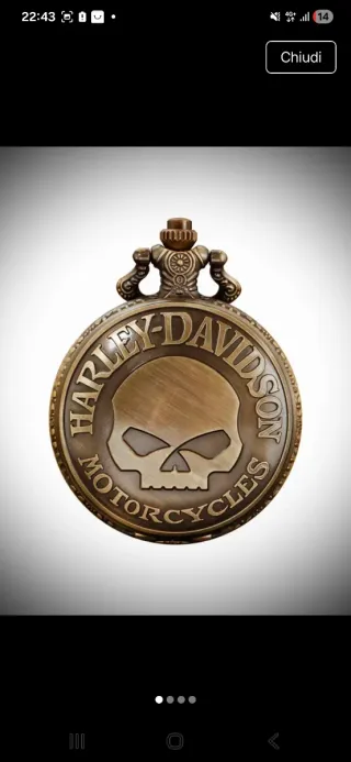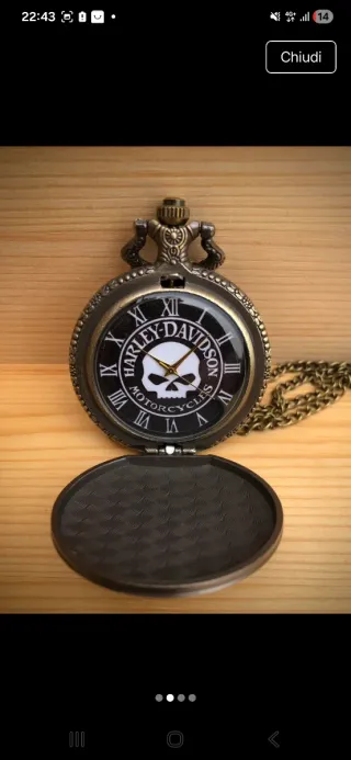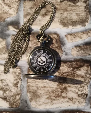 Orologio da tasca con catena, design Harley Davidson. - Cassa in metallo color bronzo. - Motivo teschio Harley Davidson sul coperchio. - Scritta Harley-Davidson Motorcycles attorno al teschio. - Catena in metallo abbinata.