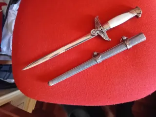 Riproduzione di un pugnale stileto TEDESCO. - Lama in metallo lucido. - Impugnatura bianca con dettagli argentati. - Fodero decorato con anelli. - Dettagli alari sull'elsa.