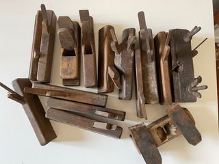 Lotto di 15 pialle antiche da falegname, realizzate in legno. - Utensili da falegnameria d'epoca. - Ideali per collezionisti o appassionati. Con lame sagomate per eseguire modanature, alcune hanno una doppia lama.