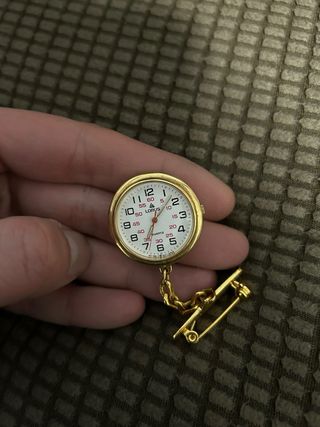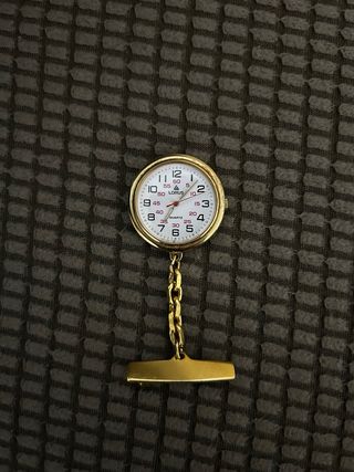 Orologio da infermiera con catenella e spilla. - Cassa dorata. - Quadrante bianco con numeri neri. - Lancette nere. - Catena dorata con spilla a T.