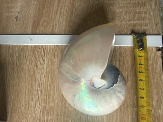 Bellissimo nautilus con finiture madreperlacee. - Superficie iridescente. - Forma ovale allungata.