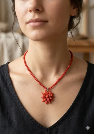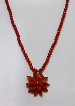 Bellissimo ciondolo a forma di fiore in corallo, con una lavorazione che ricorda lo stile vintage.Fiore in corallo sardo con collanina in corallo antica lavorazione di Torre del Greco scrupolosamente lavorato artigianalmente a mano risalente intorno al 1980 montato in argento 925 bianco - Materiale: Corallo argento 925 - Design: Fiore - Stile: Vintage