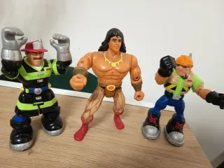Set di tre action figure. - Action figure con elmo da pompiere, tuta verde e nera, guanti grigi. - Action figure muscolosa con capelli neri, collana dorata e perizoma marrone. - Action figure con elmetto arancione, gilet multitasche, pantaloni blu e guanti neri.