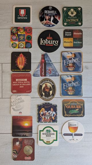 Lotto di 51 sottobicchieri di birra in cartone con vari loghi e design. Ideali per collezionisti o amanti della birra. Quelli parzialmente sovrapposti in foto sono in coppia fronte-retro.