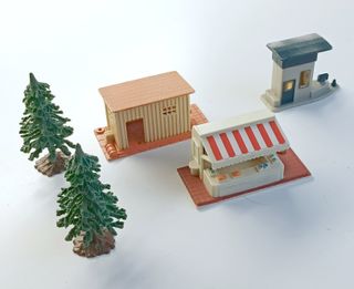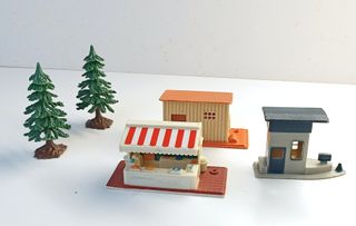 Set di 5 accessori scenografici vintage marca New-Ray, datati 1995. Il lotto comprende tre edifici in plastica (bancarella del mercato, capanno merci arancione/beige, stazione di controllo) e due alberi tipo pini. Ideali per arricchire piste di trenini giocattolo o diorami vintage. Oggetti originali con marchio impresso sul fondo. Perfetti per collezionisti di giocattoli anni '90. Il set si presenta in ottime condizioni vintage. I colori sono rimasti vivaci e le plastiche sono integre, senza crepe. Lievi segni del tempo dovuti all'età che conferiscono autenticità, ma nel complesso molto ben conservati e puliti.