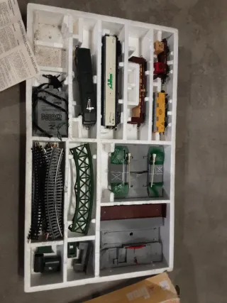 Set di modelli con tutti i suoi componenti. Tutti gli elementi sono del marchio Marklín e vengono utilizzati pochissimo. Il set include: 4 locomotive: 2 in carbonio + 1 elettrica + 1 in carbonio doppio smontata. Più di 10 vagoni, alcuni con passeggeri doppi. Controller digitali e analogici. +100 strade diritte. +30 curve e giunzioni. Elementi scenici, ponti, torri, stazione moderna, vecchia stazione... Il piano mostra quale tipo di modello può essere assemblato con questi elementi, alcuni elementi aggiuntivi e ferri da stiro per la sua costruzione vengono regalati. Tutto è operativo tranne la locomotiva smontata, digitalizzata e lasciata a metà.