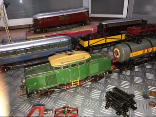 Set di trenini elettrici Ibertren 3N. - Locomotiva verde. - Carri merci. - Carro cisterna. - Binari ferroviari. - Trasformatore Ibertren. L'ho comprato nuovo ed è stato usato raramente, tutti gli elementi sono in ottime condizioni.