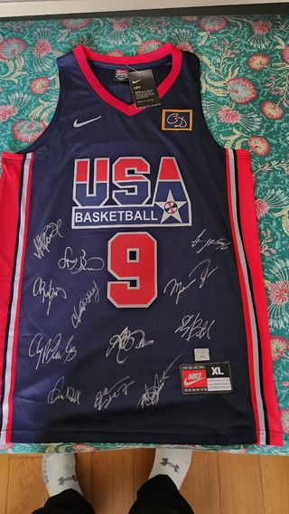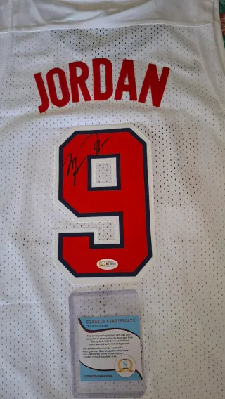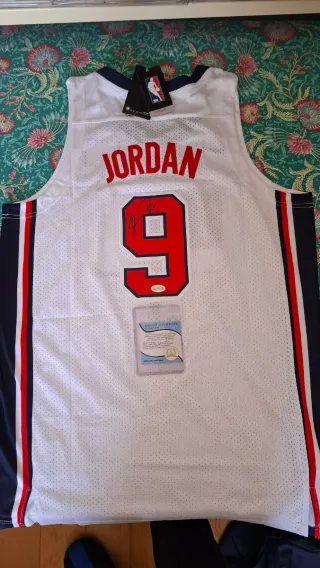 Maglia Team USA autografata di Michael Jordan, numero 9. - Maglia bianca con dettagli rossi e blu. - Autografo di Michael Jordan sul numero 9. - Certificato di autenticità incluso verificabile online.